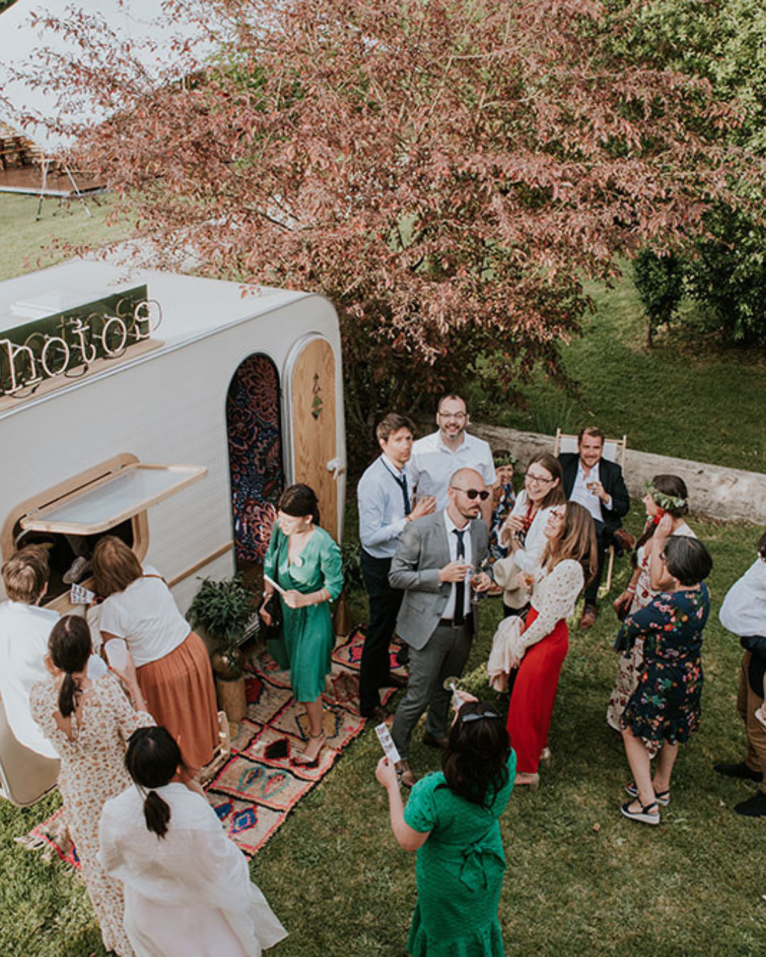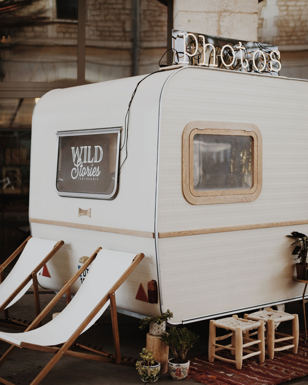 À l’intérieur : un photobooth intégré avec système de paiement, un fond photo au choix, et toute l'expérience Wild Stories